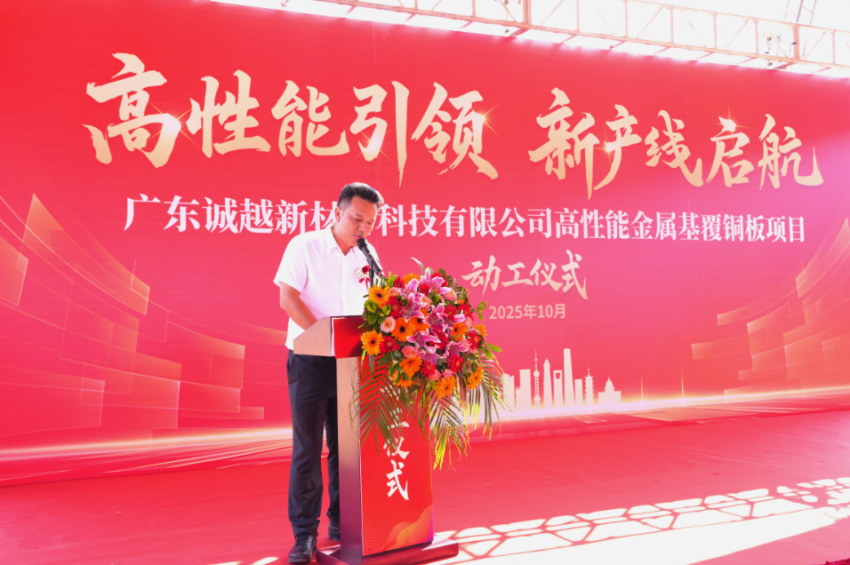 广东诚越董事长肖政强在致辞中表示:"高性能金属基覆铜板项目的顺利启动与高效推进,离不开政府及各级相关职能部门的高度重视与鼎力支持。这是公司战略布局的关键一环,更是我们响应国家创新驱动发展战略、助力制造业转型升级的重要举措。”
