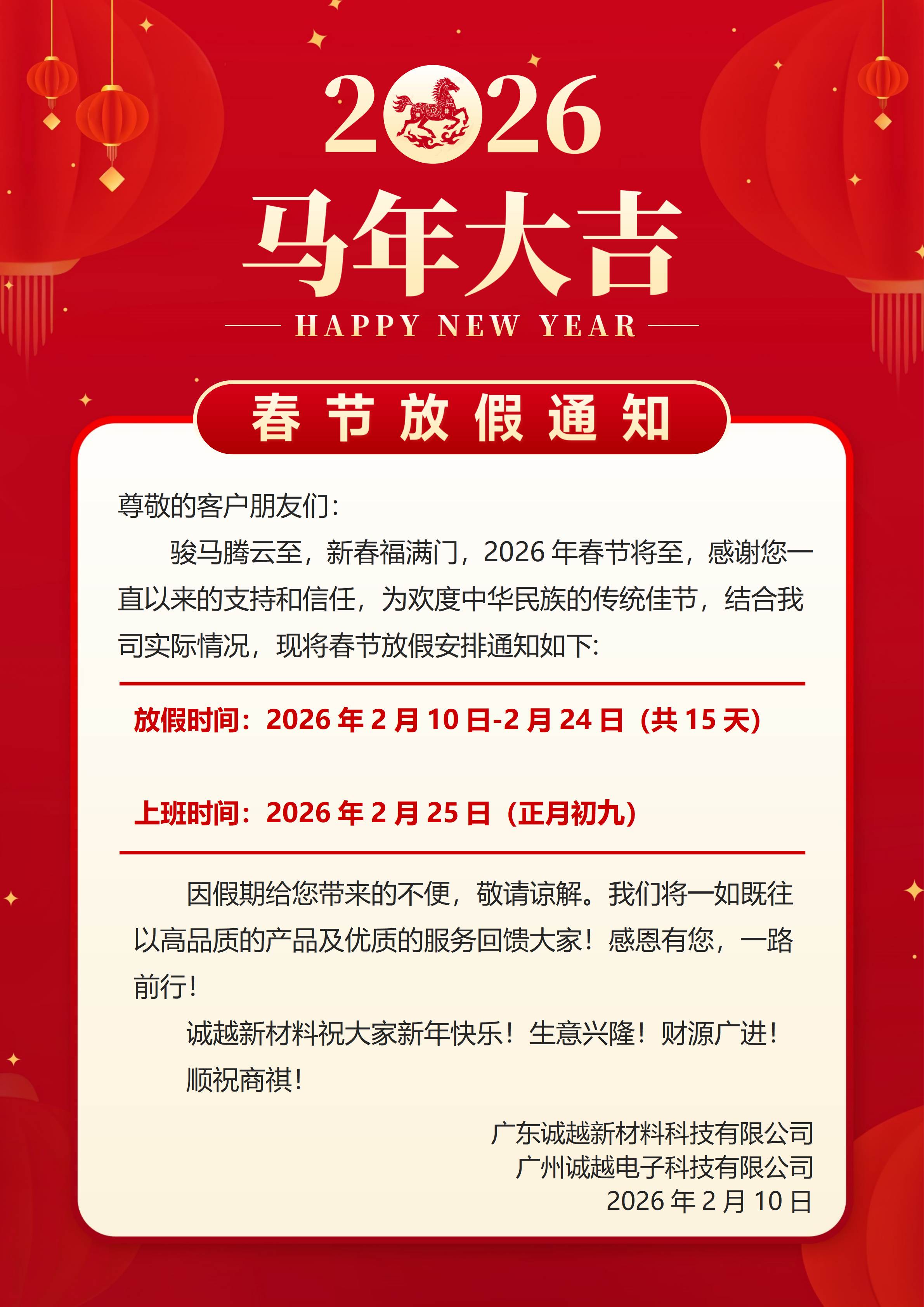 《广东诚越新材料科技有限公司 2026 年春节放假通知》