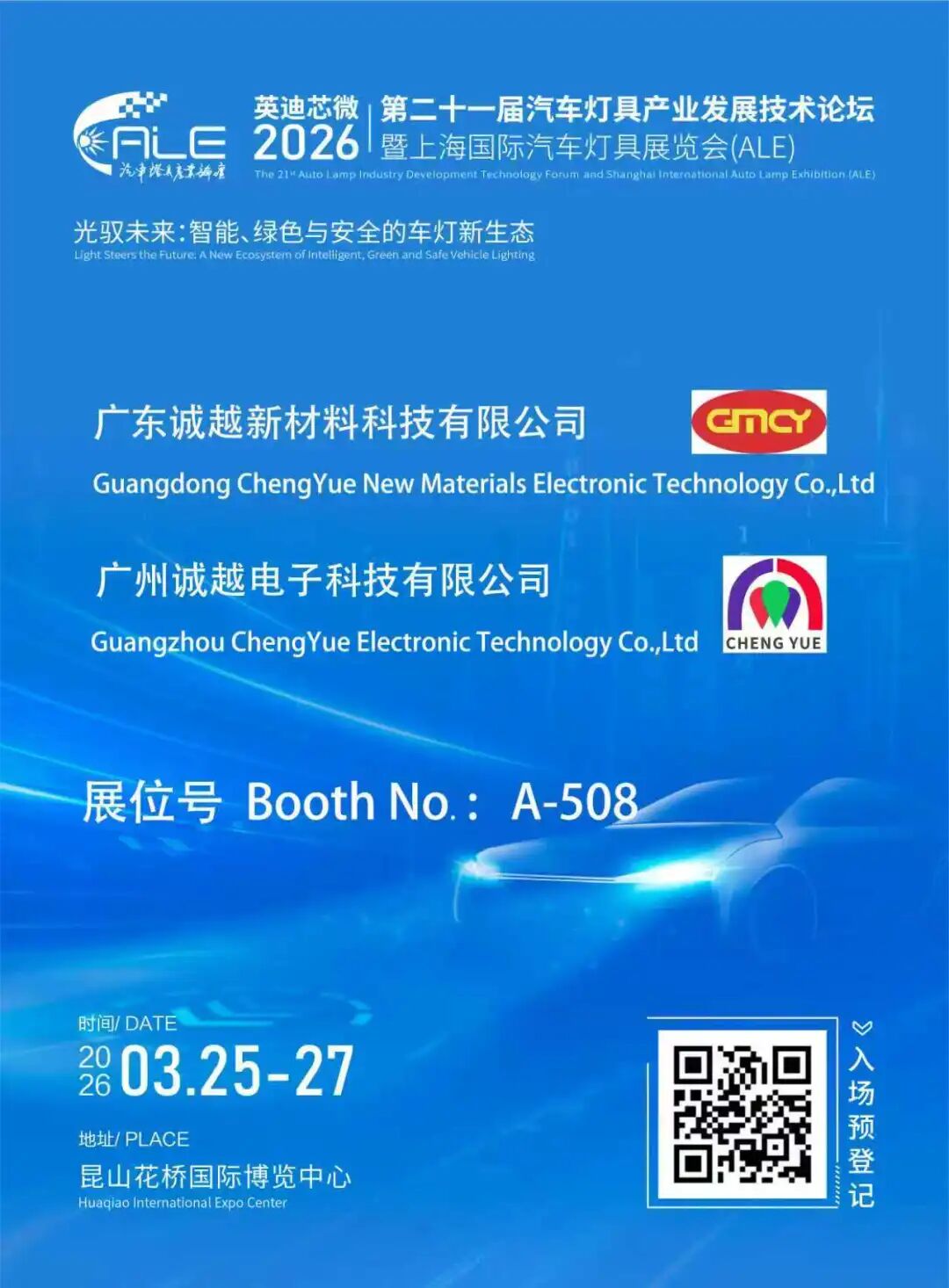 广东诚越新材料科技有限公司诚挚邀请您莅临 2026年3月25日至27日在上海昆山花桥国际博览中心举办上海国际汽车灯具展览会(ALE)展位号:A-508。